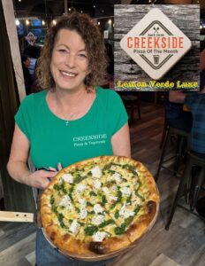 Spring screams for bright colors and flavors, and Lemon Verde Luxe answers the call: Creekside crust drizzled with an extra virgin olive oil base (no red sauce), a light coating of whole milk mozzarella, thinly-sliced fresh Meyer lemons, finished with house made organic kale pesto, burrata cheese, lemon zest, and black sea salt. This month’s zesty spring pizza was created by Karin Donlan.